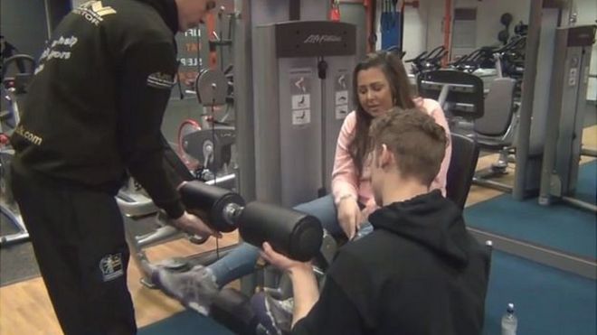 is training with Felicia Sheingold: he is progressing brilliantly, and has moved in a couple of months from standing for a few minutes by himself, to walking unaided and moving onto a weights programme! Go Simon!!