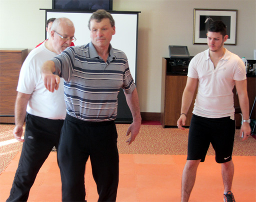 In January 2005 Tom moved to west London (Isleworth) which took an hour off my travelling time. To begin with Tom got me training in the University grounds where he was working, doing bench presses and shoulder and leg work on awkward objects like heavy boxes. He also got me working out using his bands which are excellent (I bought a set!). We eventually joined LA Gym in Isleworth which was good as it has a large hall so we could do martial arts and also a good weights section. Recently Tom has got me doing squats as well defending myself with my bad arm and trying to get out of holds with it, all of which are good exercises.
