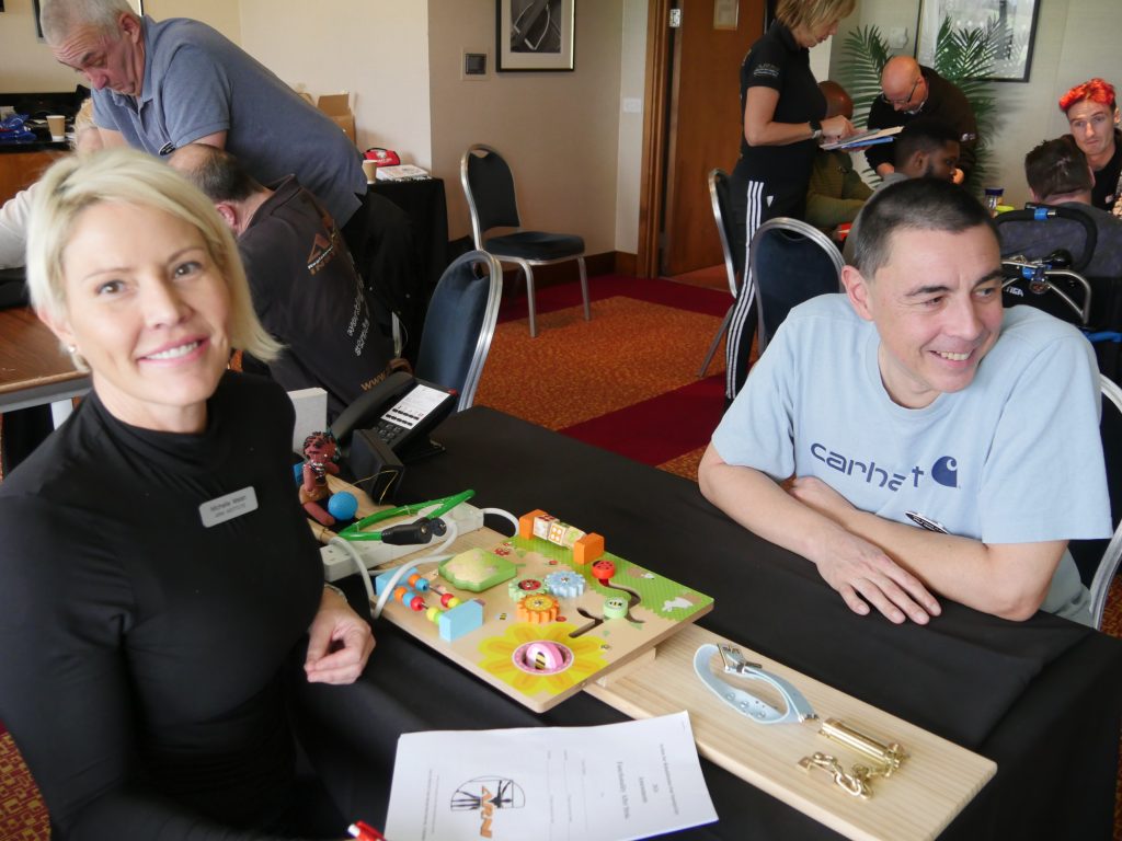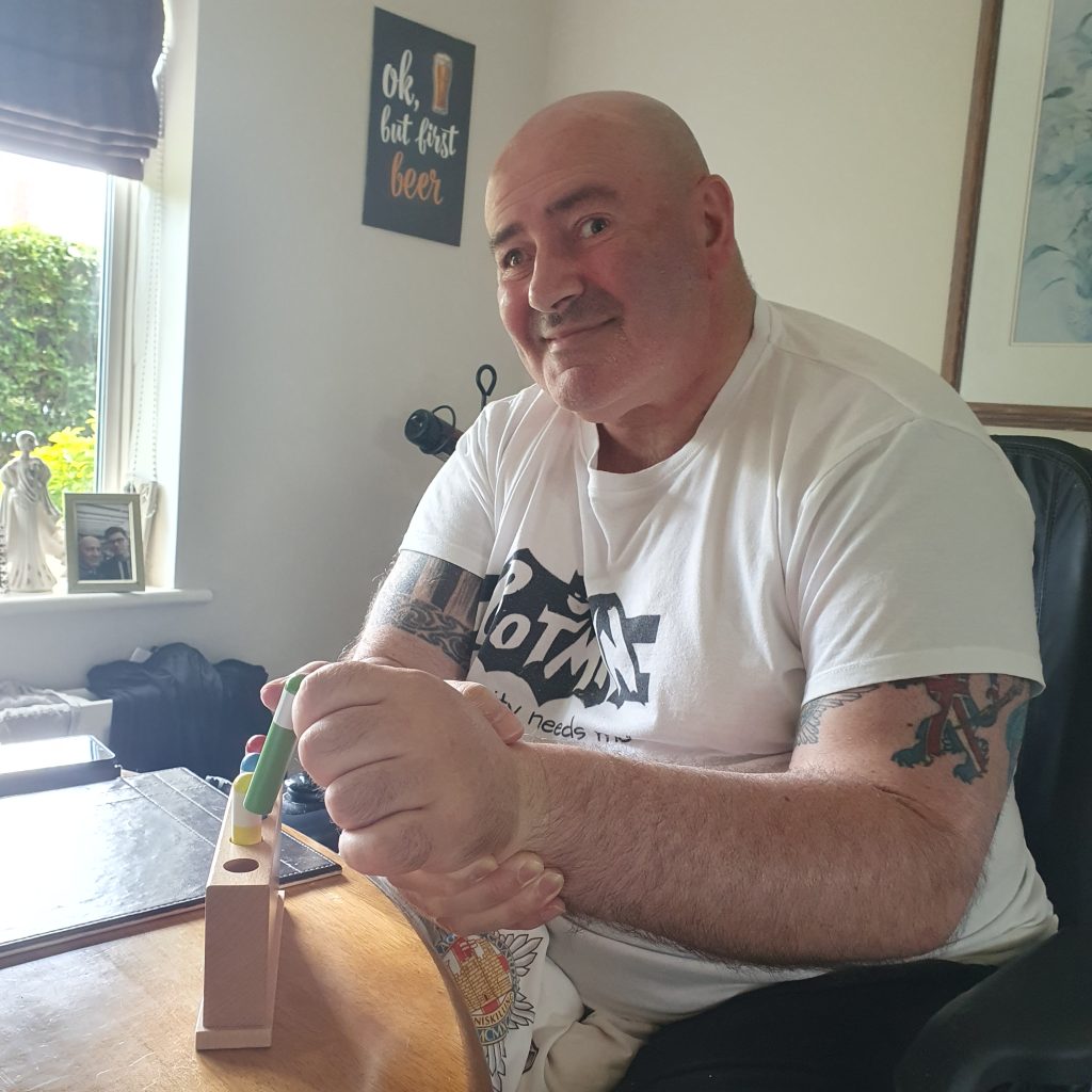 Maria says ‘Mark is really motivated; always look forward to our training sessions. The first time I showed him those pop-up men or ‘The Houses of Parliament’ as we call them, his eyes filled with fear! But, after massive doses of repetitive training, he’s able to reach forward (with minimal ‘Body English’) take them out with his index and thumb mainly and then put them back in the slots! When I’m there, we are able to ‘open’ his fingers and thumb to ‘get the gap’ allowing him to involve his middle finger also for reps. Actual release without assistance of the slots is coming along too. He’s doing this using our ARNI programme of very high numbers of reps daily. He also is starting to do the same grasp and release task using lots of different items with his ARNI task-board. He does need a way to support his arm as he trains though and I’m thinking he may do well to try a Saebo-Mas. Go Mark!