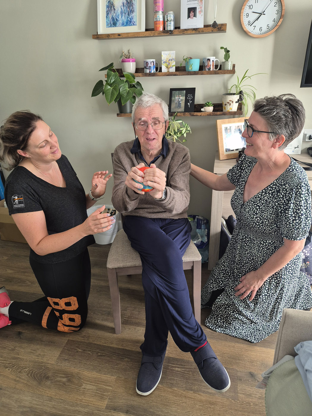 When Carol first started working with Peter in May this year (2024), he had no confidence. He was still walking with a stick and his balance wasn’t great. Within the first 2 sessions he was able to get down to the floor and up again, using a chair. Once he’d gained this skill, his confidence soared and Peter was happy to try anything Carol threw at him.